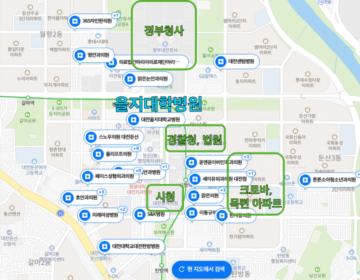 둔산권역은 학원가 및 상권가가 대전에서 가장 잘 발달되어 있습니다. 특히 이곳의 학군은 매우 유명합니다. 시청 옆 크로바 아파트, 목련아파트는 학군으로만 따지면 최상급 입지에 위치하고 있습니다. 얼마 전 방영되었던 드라마 '스카이캐슬'의 배경이 크로바아파트라는 후문도 있을 정도입니다. 병원, 학원, 상권가 모두 사업의 영역이므로 집계에는 포함하기 어렵지만 양질의 일자리에 해당합니다.
