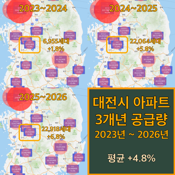 2023년 4월 ~ 2024년 4월까지 1년간 대전 아파트 공급량은 6,955세대로 1.8% 증가하는 수준입니다. 2024년 ~ 2025년에는 급격히 +5.8%로 공급량이 증가합니다. 2026년까지의 공급량 증가는 +6.8% 로 2025년까지에 비해 1% 증가합니다.