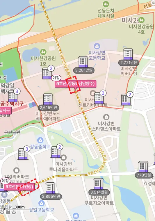 그렇지만 9호선이 미사에 연장 다는 것은 기정사실이며, 노선도 어느 정도 확정된 상태입니다. 다만 미사 9호선 정거장 위치 등 구체적인 사항이 아직 공개되지 않았는데요. 정거장 위치만 공개된다면 미사의 입지는 재평가될 것입니다. 즉 현재의 미사에서 입지가치가 폭발적으로 성장할 가능성이 있다는 의미입니다.