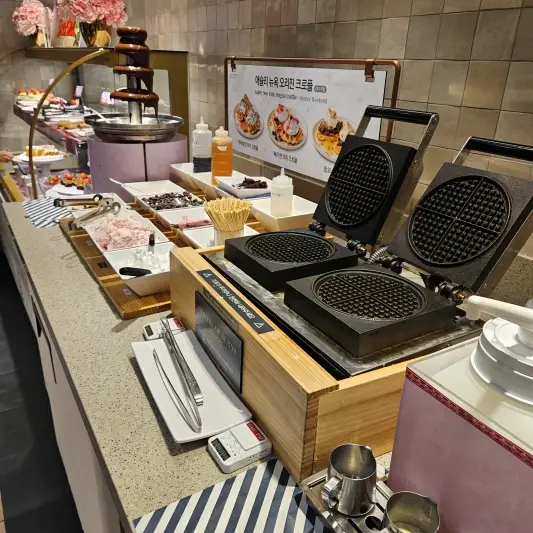 와플은 우리가 잘 알고 있듯이 기본반죽으로 된 와플 외에도, 크로와상 와플도 준비되어 있었습니다. 한번 구워진 크로와상 자체를 와플 기기에 눌러서 다시 굽는 방법도 있는데, 애슐리 퀸즈 크로와상와플(크로플)은 크로와상 반죽을 그대로 와플기기에 올려두고 굽는 방식이었습니다.