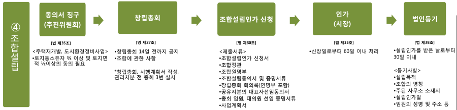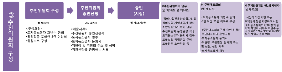 절차 : 1. 기본계획 수립 → 2. 정비구역 지정 → 3. 추진위원회 구성 → 4. 조합 설립 → 5. 사업시행 인가 → 6. 관리처분계획 인가 → 7. 착공 및 분양 → 8. 사업의 완료(준공, 청산)